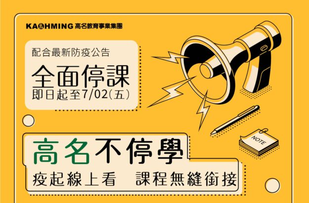 全面停課同步延長至7/02(五),高名不停學,進步不停歇 行政公告By 高名教育事業集團|KM Education Enterprise Group2021 年 6 月 8 日Leave a comment配合政府防疫,教育部宣布全國各級學校全面停課期間延長至7/2(五),高名教育事業集團為孩子及全民安全考量,全班…