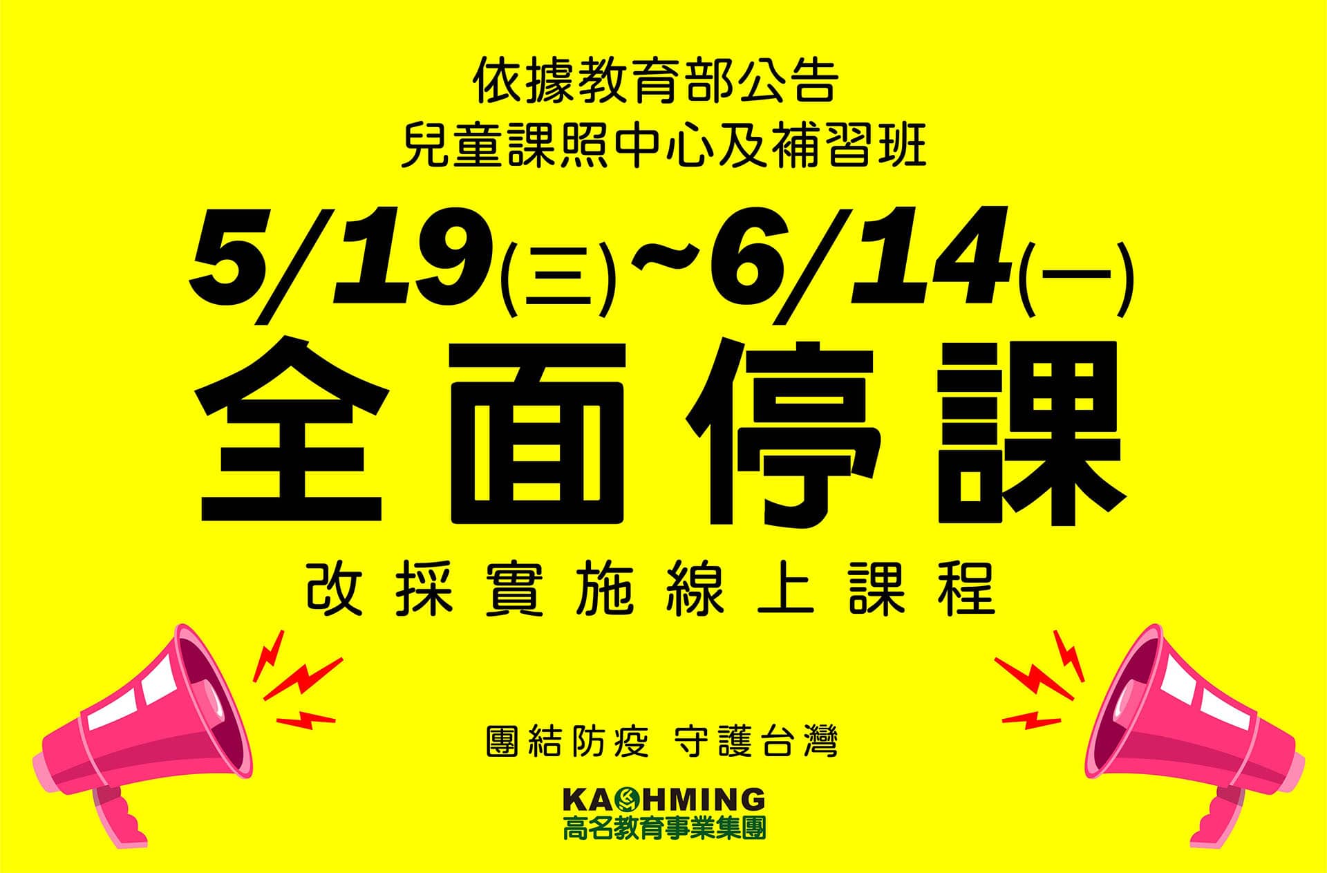 【停課公告】高名集團即日起至6月14日全面停課,團結守護台灣,齊心抗疫最新消息, 行政公告2021 年 5 月 18 日親愛的家長、同學,大家好: 配合教育部今日宣布全國各級學校全面停課,高名教育事業集團為孩子及全民安全考量,所有… 觀看全文